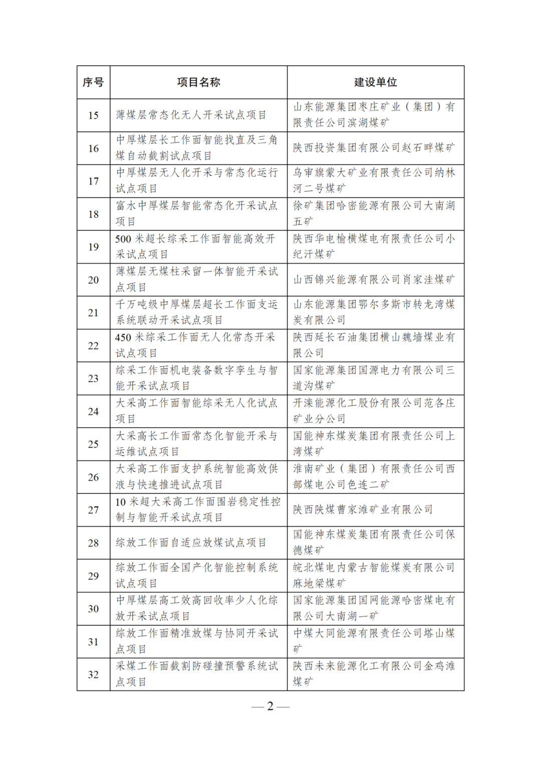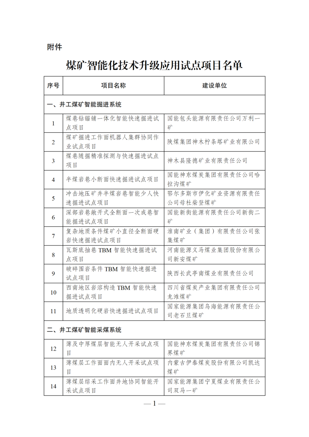 国家能源局网站2月9日消息,为加快煤矿智能化关键技术攻关和推广应用,迭代提升煤矿智能化建设运行水平,根据《国家能源局综合司关于开展煤矿智能化技术升级应用试点工作的通知》,经组织申报、初审推荐、专家评审和网上公示等程序,确定“煤巷钻锚铺一体化智能快速掘进试点项目”等77个项目为煤矿智能化技术升级应用试点项目。现将试点项目名单予以公布。