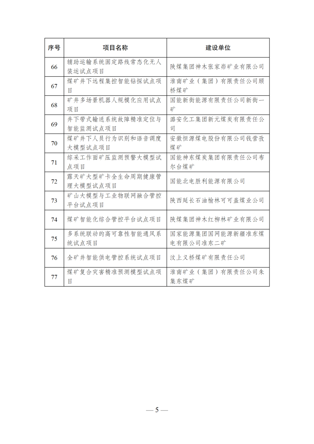为深入贯彻落实党中央和国务院关于优化提升传统产业的决策部署,加快煤矿智能化关键技术攻关和推广应用,迭代提升煤矿智能化建设运行水平,根据《国家能源局综合司关于开展煤矿智能化技术升级应用试点工作的通知》(国能综通煤炭〔2025〕120号),经组织申报、初审推荐、专家评审和网上公示等程序,确定“煤巷钻锚铺一体化智能快速掘进试点项目”等77个项目为煤矿智能化技术升级应用试点项目。现将试点项目名单予以公布,并就有关事项通知如下。