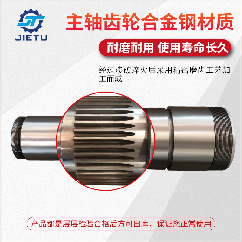 主轴的选材及加工精度对设备运行效率及寿命有着决定性影响,精选42CrMo材质,毛坯为锻打料,具有高强度和韧性,淬透性较好,无明显的回火脆性,有较高的疲劳极限和抗多次冲击能力,韧性良好,螺纹丝距紧凑,与机器连接紧密,螺纹经过精密计算,CNC精加工,与机器精确连接,主轴齿轮坚固,耐磨耐用,齿轮低碳合金钢材,经过渗碳淬火后采用精密耐磨齿工艺加工而成,主轴内外表面光滑无瑕疵,放心使用,售后无忧,CNC精加工,每件产品都是匠心制作,严格按照设计师图纸执行,在煤矿钻机的施工中,主轴功不可没,它的稳定性、耐磨性及寿命直接影响设备的稳定性及施工效率。